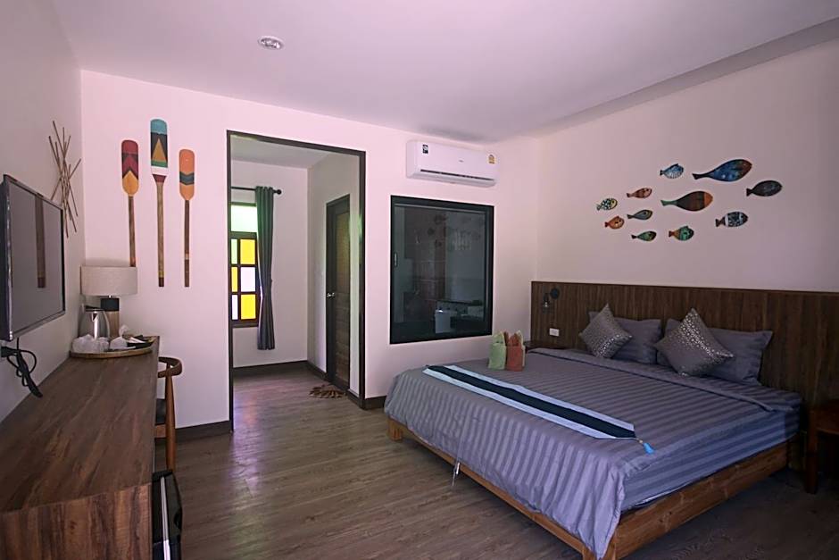 This bungalow features a bunk bed with a queen-sized bed on the lower bunk and a single bed on the top bunk.